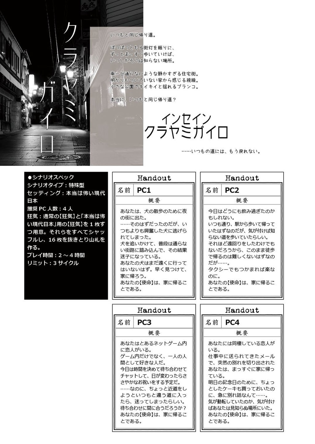 過度にグロテスクな表現などは避けるつもりですが、『インセイン』は恐怖と狂気をテーマにしたシステムとなっていますので、ホラーが苦手という方は他の卓を希望されたほうがよろしいかと思います。