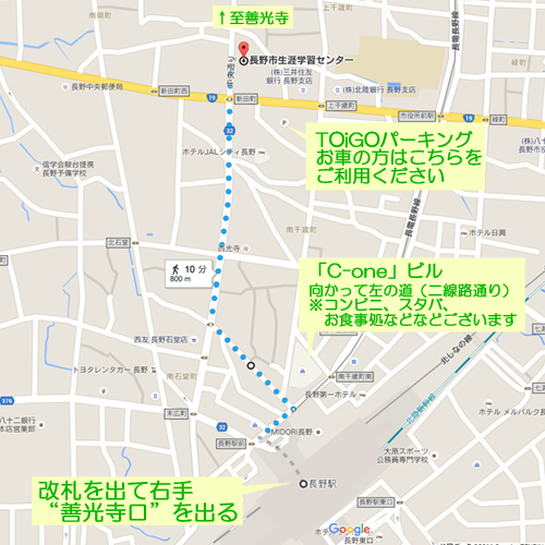 ①長野駅の改札は一つです。出て右側を直進しましょう。